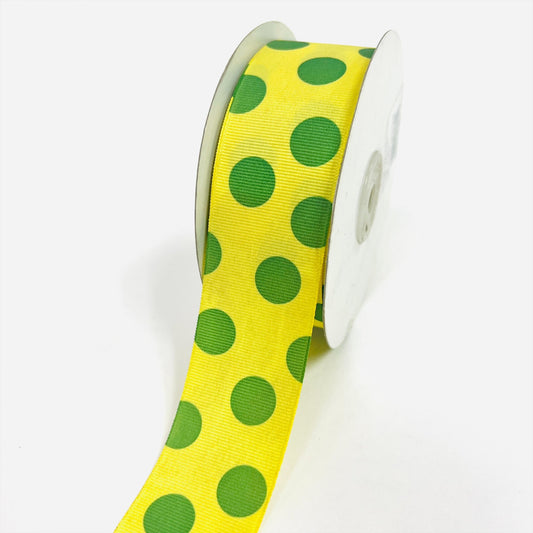 Grosgrain Ribbon Jumbo Dots Canary with Apple Green Dots ( W: 1 - 1/2 Inch | L: 25 Yards )