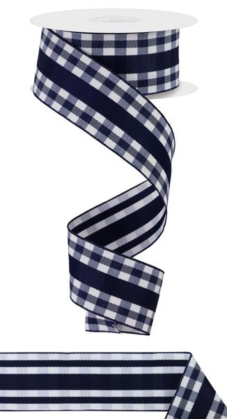 1.5 Inch x 10 Yards Gingham Check with Hex Glitter Ribbon - Dark Navy/White/Silver