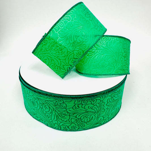 Emerald Flower Embossed Wired Ribbon - 2-1/2 Inch x 50 Yards