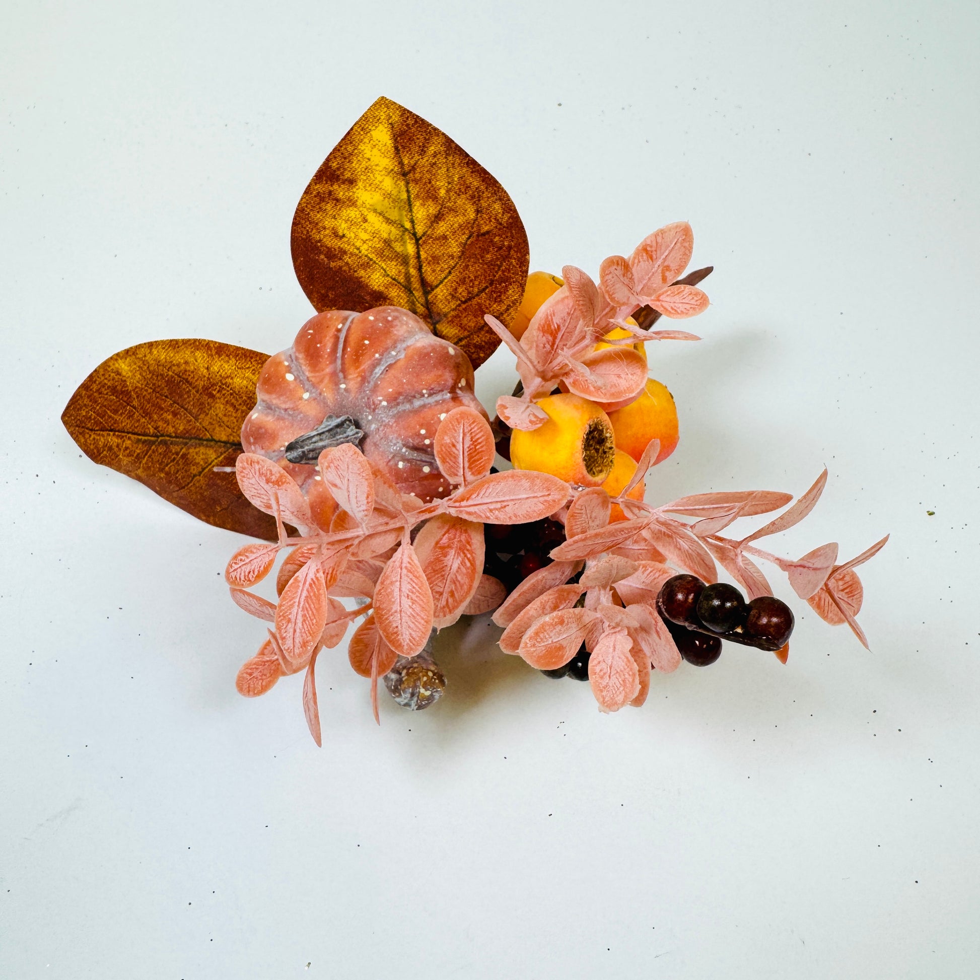 Charming Pumpkin Design: Features a realistic mini pumpkin in rich orange tones, accented with detailed green leaves and berries.