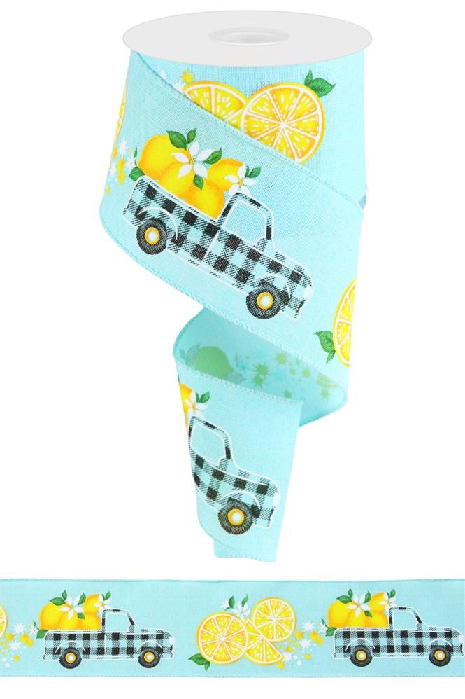 Ice Blue Yellow Green White Black - Gingham Truck W/Lemons Ribbon - 2-1/2 Inch x 10 Yards