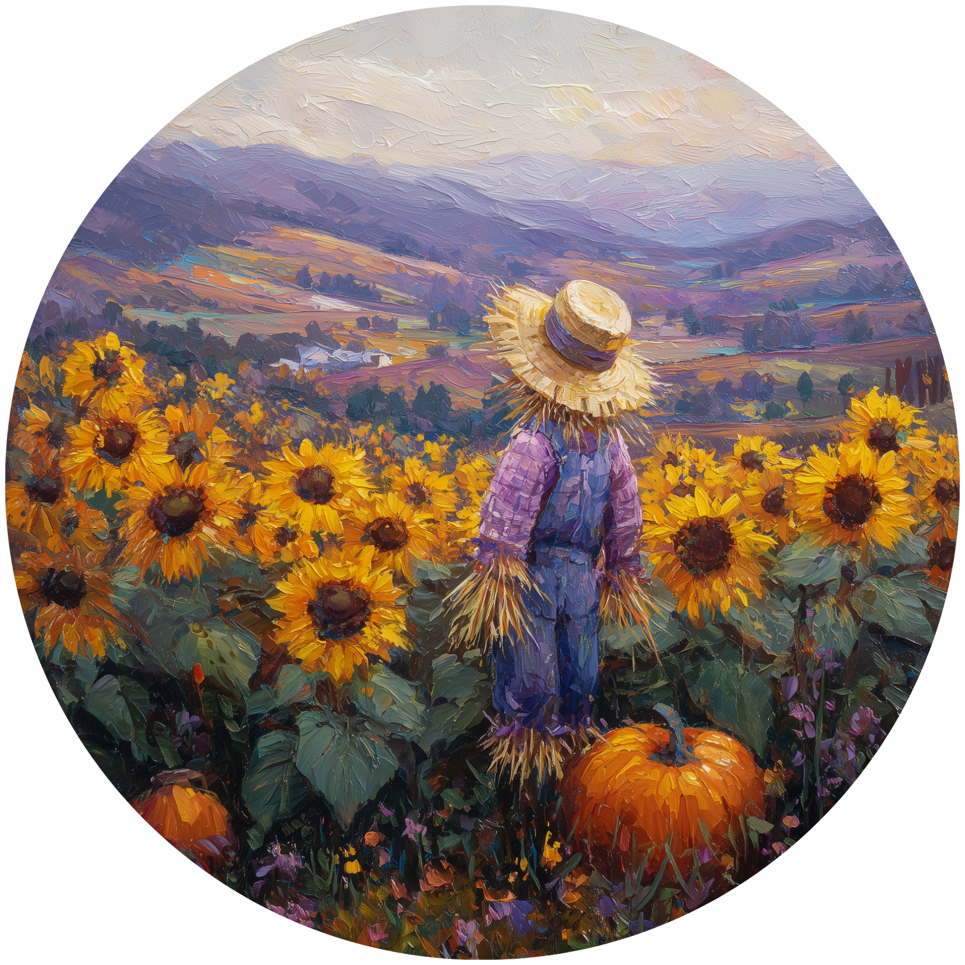 Scarecrow in Sunflower Field with Pumpkins Accent Sign - Made in USA