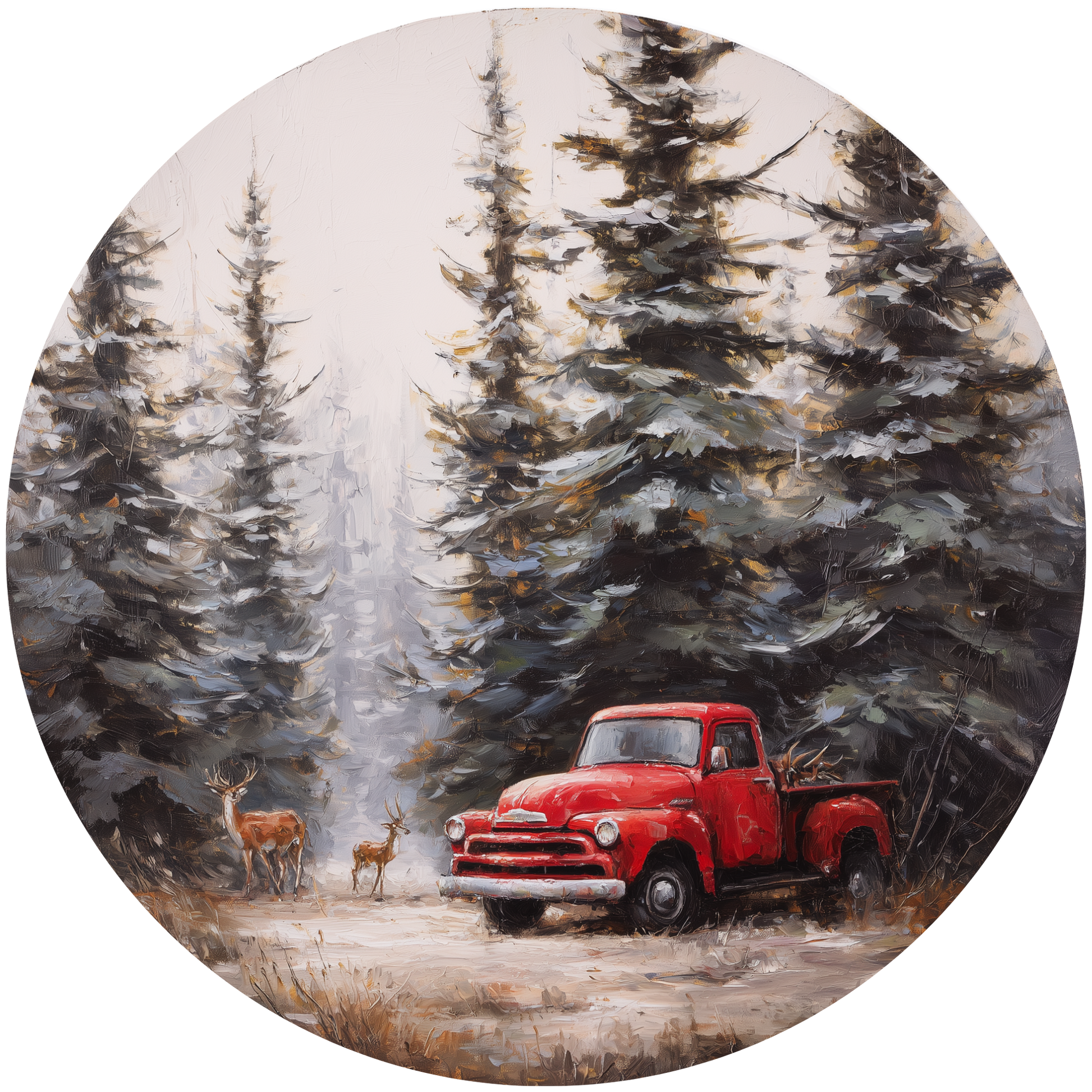 Red Truck and Deer in Snowy Pine Forest Accent Sign - Made in USA